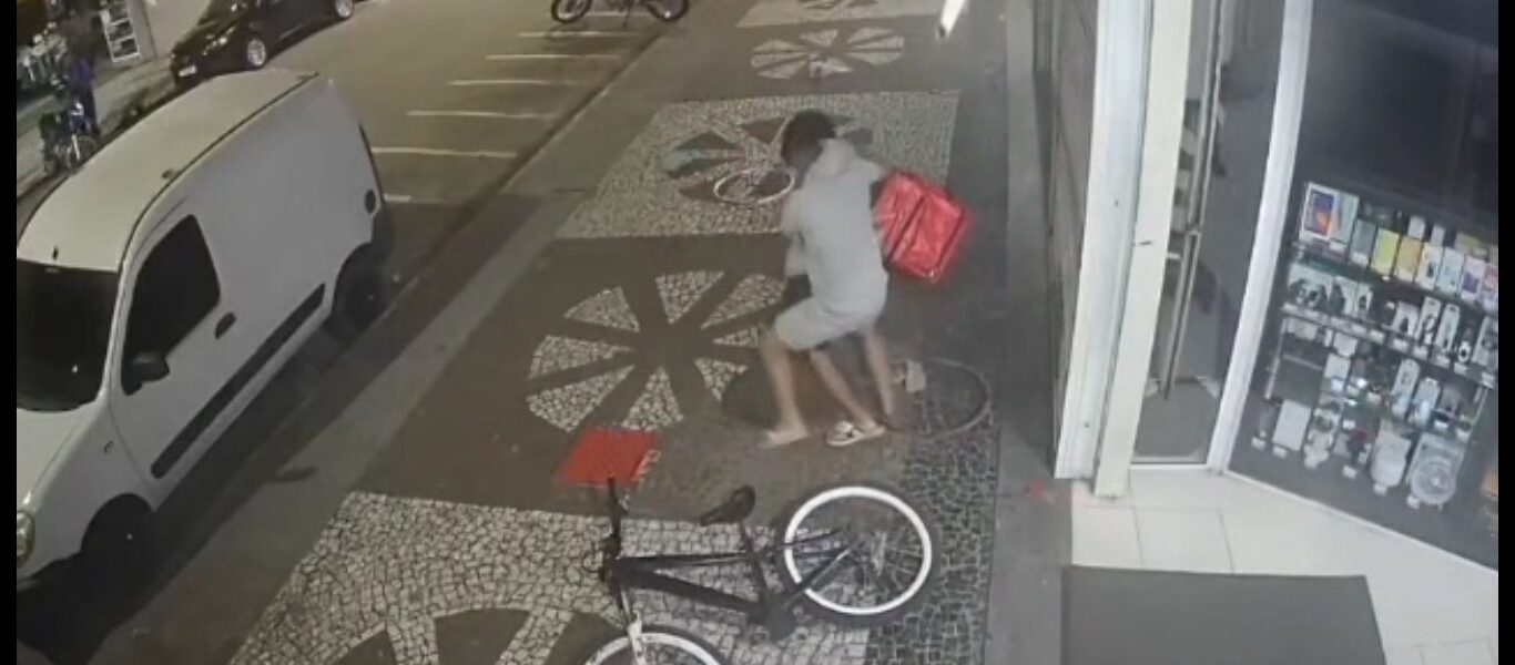 Nas imagens (veja acima), o entregador aparece em frente a um estabelecimento quando é atacado por um homem, que começa a agredi-lo com socos. O trabalhador cai, mas as agressões continuam.