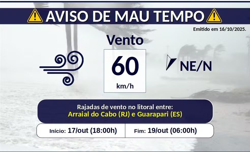 A Marinha do Brasil emitiu um alerta de ventos fortes, que podem chegar a 60 km/h, em seis municípios do Espírito Santo entre a noite de sexta-feira (17) e a manhã de domingo (19).